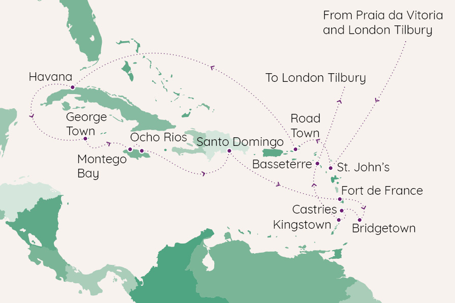 Follow the path of intrepid explorers across the Atlantic Ocean to reach the azure waters of the Caribbean Sea. Explore a range of enchanting destinations that provide opportunities for fun, relaxation, and authentic local experiences. From the historic charms of Havana to the sun-soaked beaches of Ocho Rios, the rhythms of Montego Bay to the cultural richness of Santo Domingo, each port offers a unique taste of Caribbean delights to help you create lasting memories on this tropical odyssey.